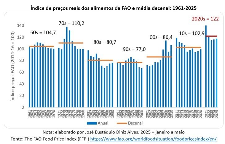 A década dos anos 2020 foi marcada, até aqui, pelo aumento acelerado dos preços dos alimentos no mundo. O índice de preços da Organização das Nações Unidas para a Alimentação e a Agricultura (FAO) mostra que, de 2021 a 2025, a média do índice ficou em 122 pontos (a FAO usa os dados de 2014 a 2016 como índice 100).