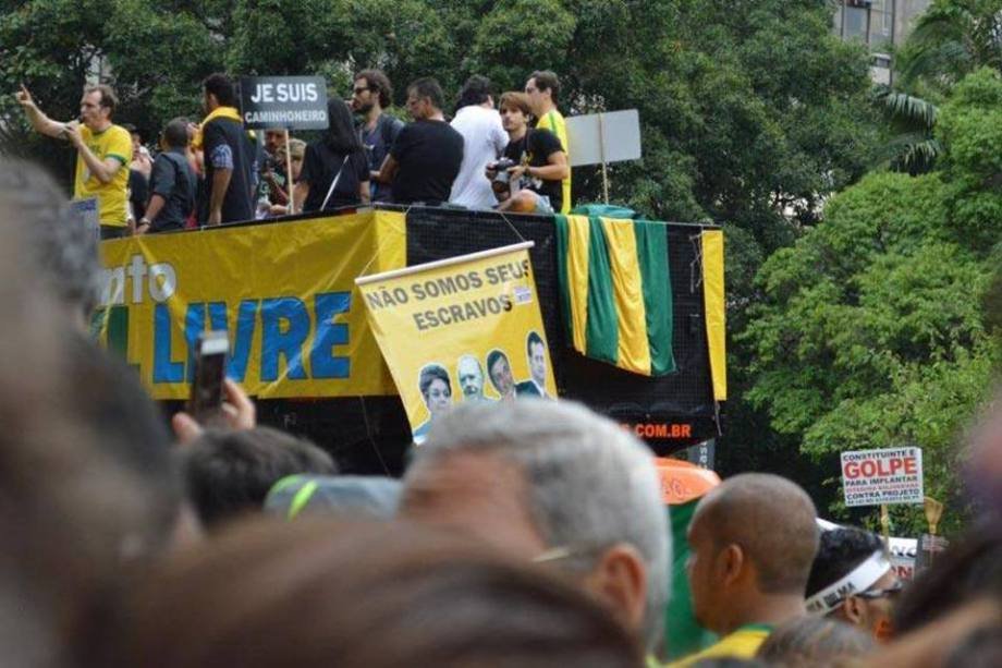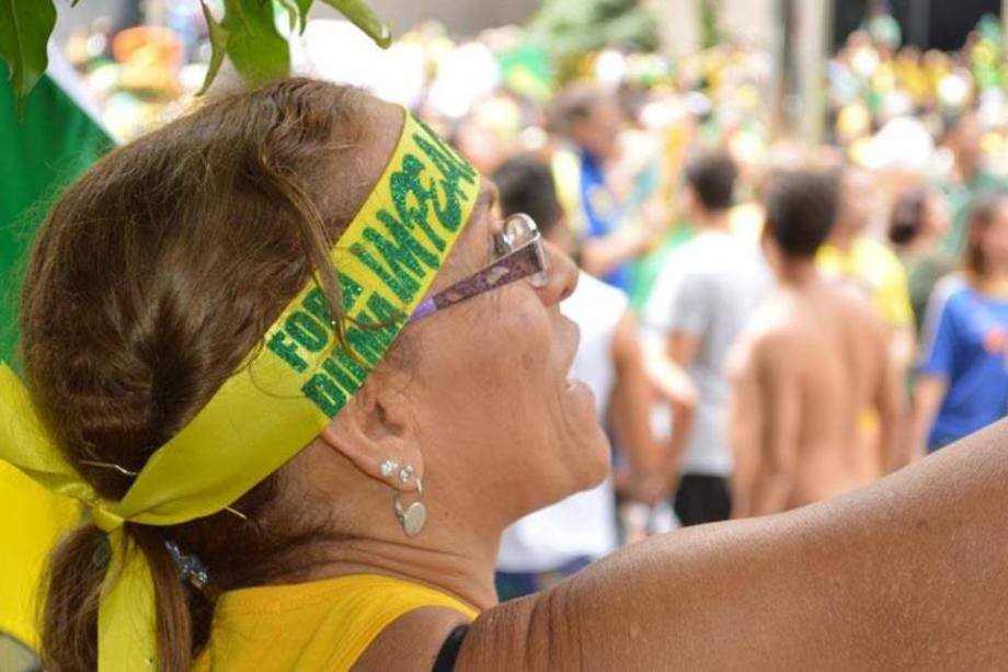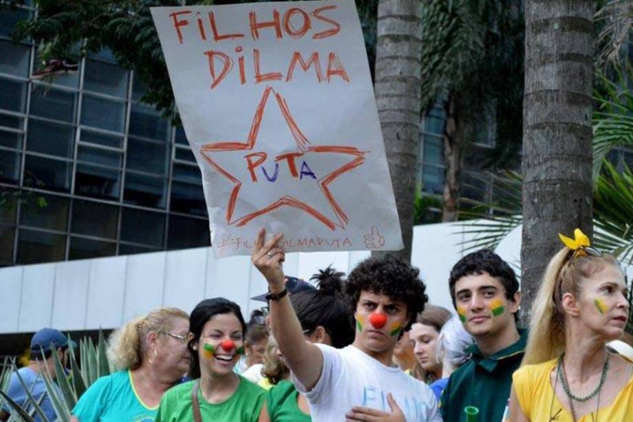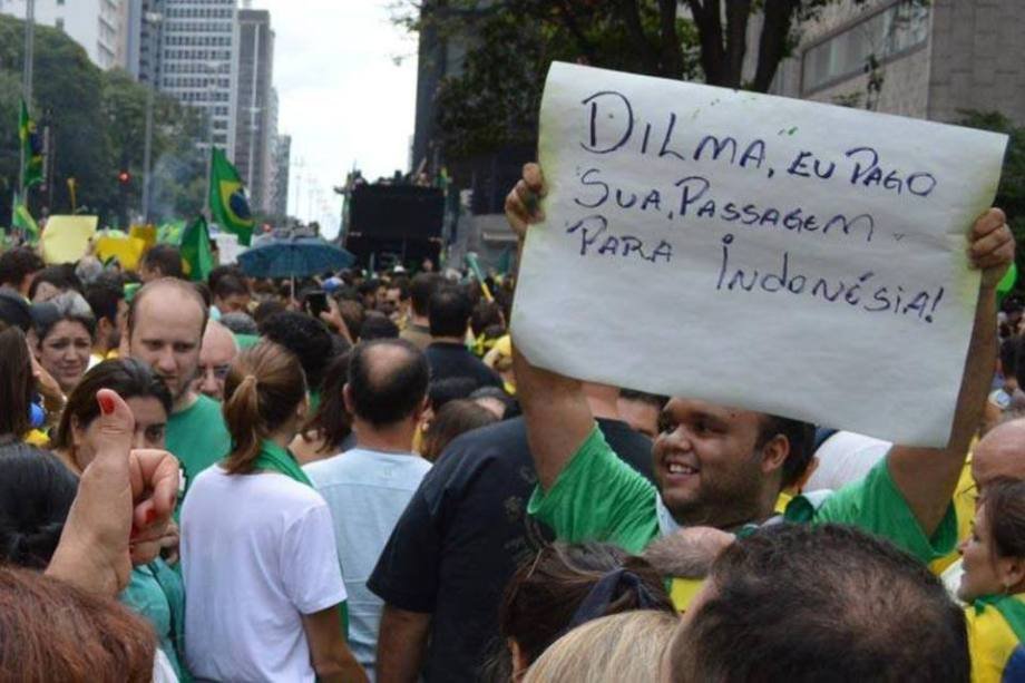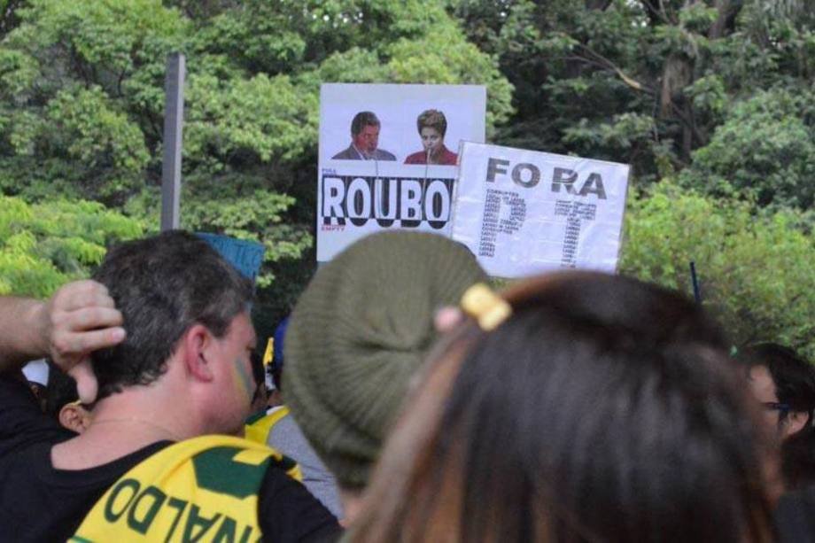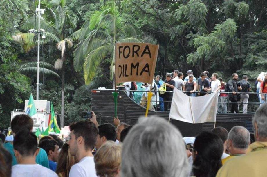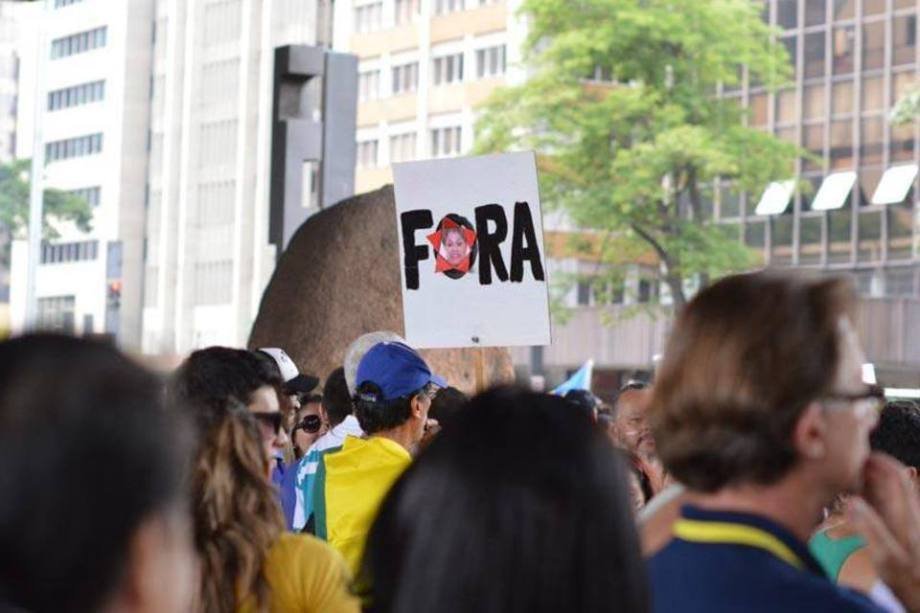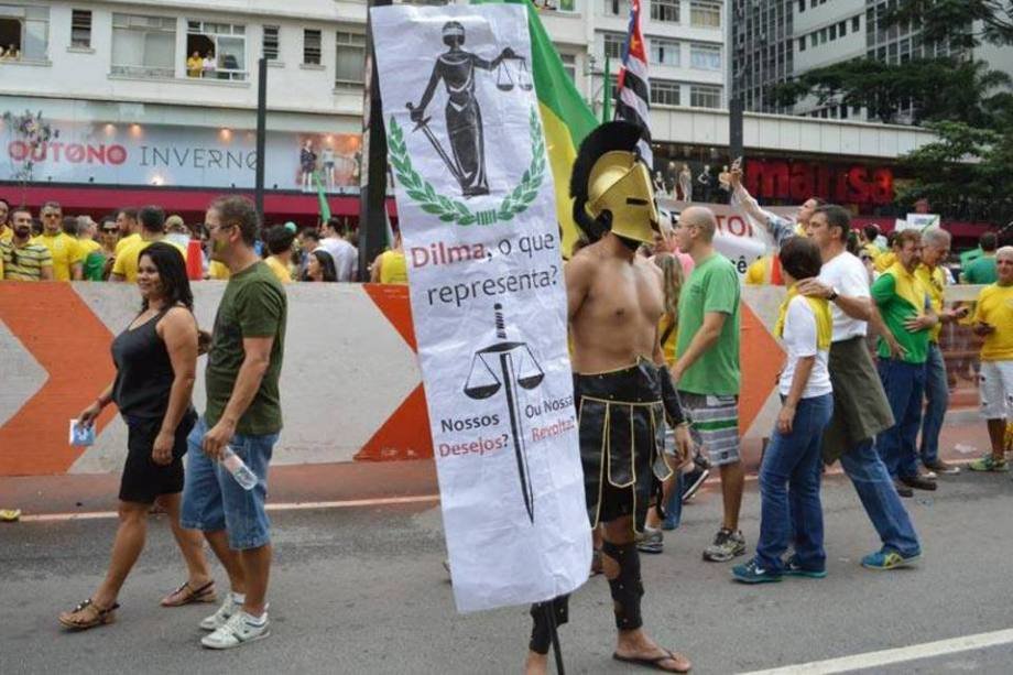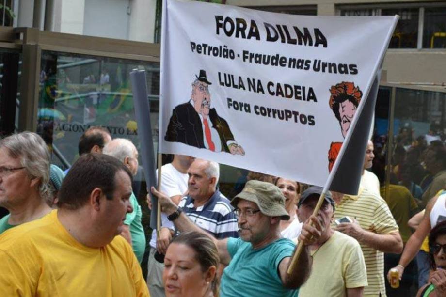 Vestidos de verde e amarelo, muitos dos manifestantes carregavam cartazes e faixas na cabeça pedindo o impeachment da presidente e outros poucos pediam uma intervenção militar.