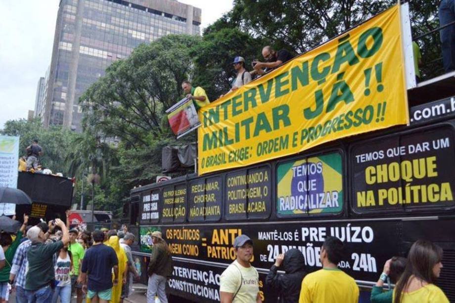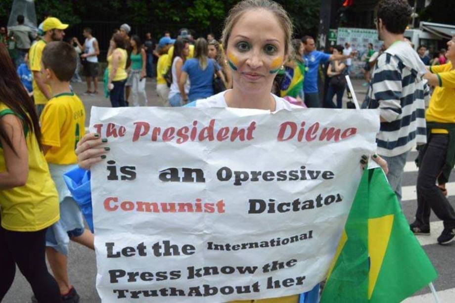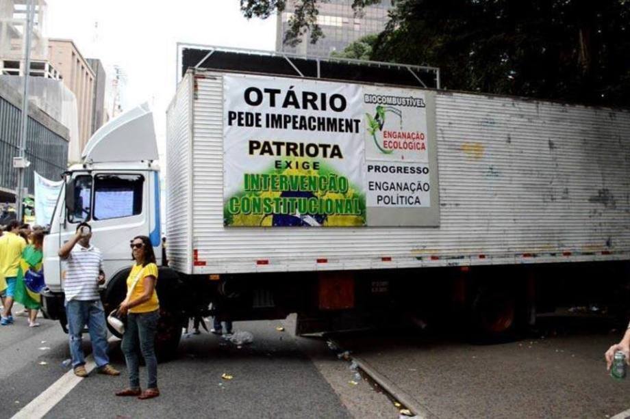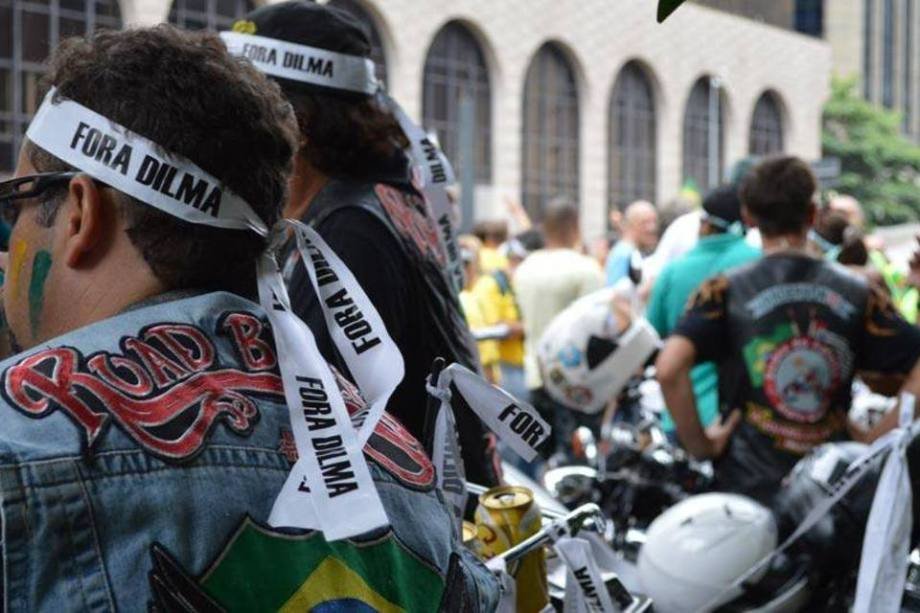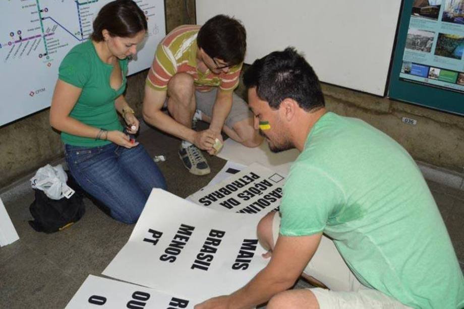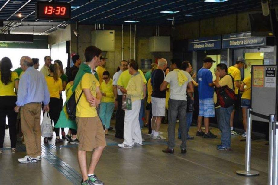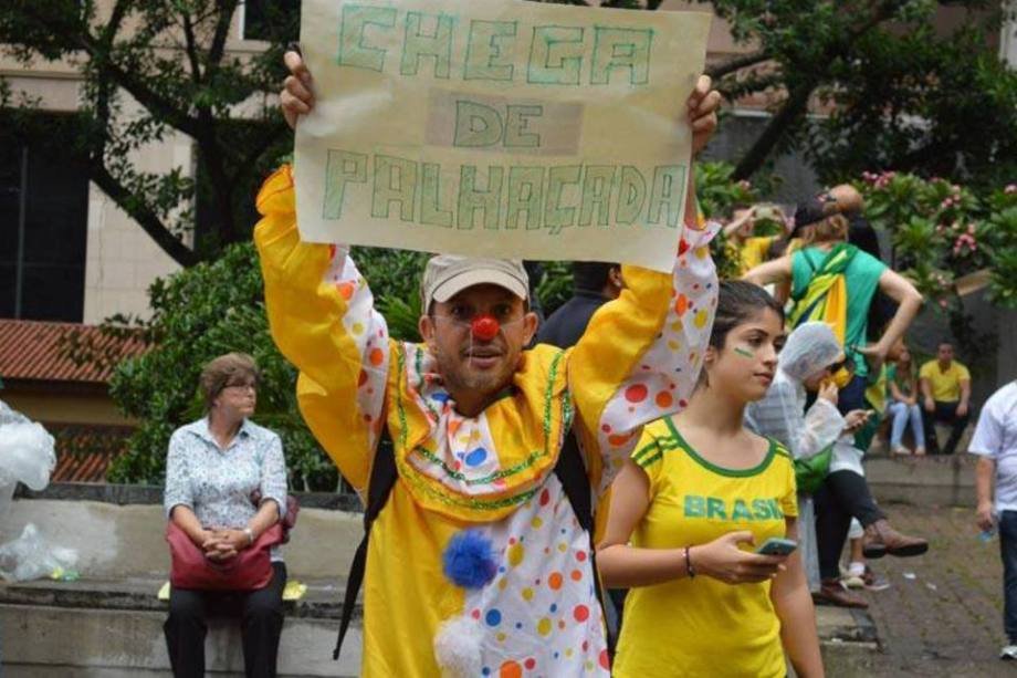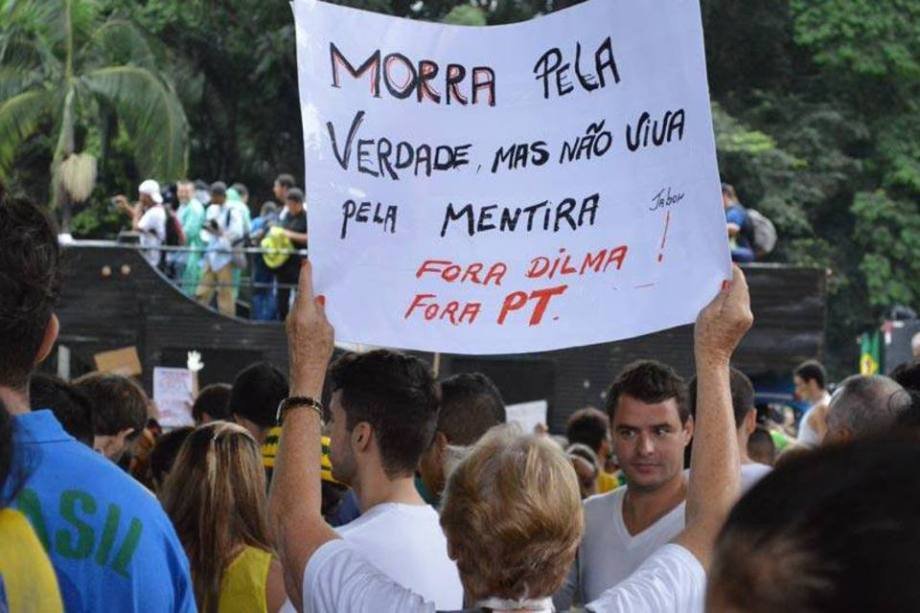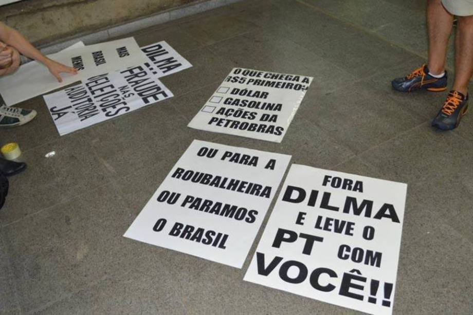 Vestidos de verde e amarelo, muitos dos manifestantes carregavam cartazes e faixas na cabeça pedindo o impeachment da presidente e outros poucos pediam uma intervenção militar.