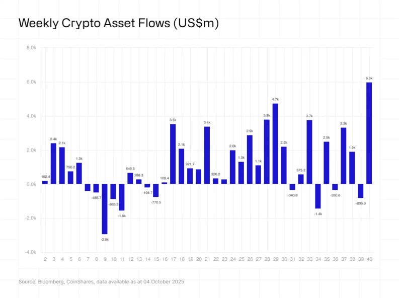 Os fundos à vista voltaram a engatar entradas pesadas: US$ 5,95 bi na semana até 4 de outubro, dos quais ~US$ 3,55 bilhões em bitcoin. Isso coincidiu com a quebra de máxima histórica (~US$ 125 mil–126 mil). Wall Street voltou a comprar bitcoin via ETFs depois de uma pausa no início de setembro.