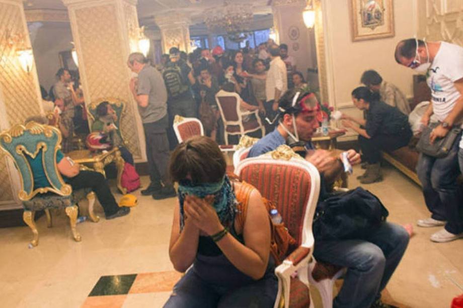 10. Pessoas tentam se proteger de gás lacrimogêneo entrando em um hotel