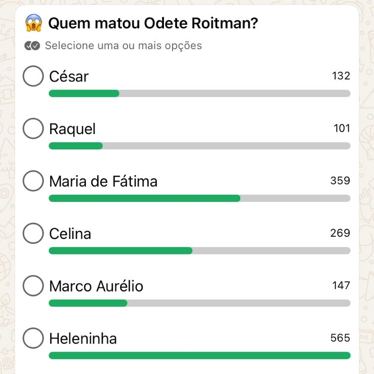 Com o total de 1.589 votos totais, 565 leitores acreditam que Heleninha assassinou Odete.