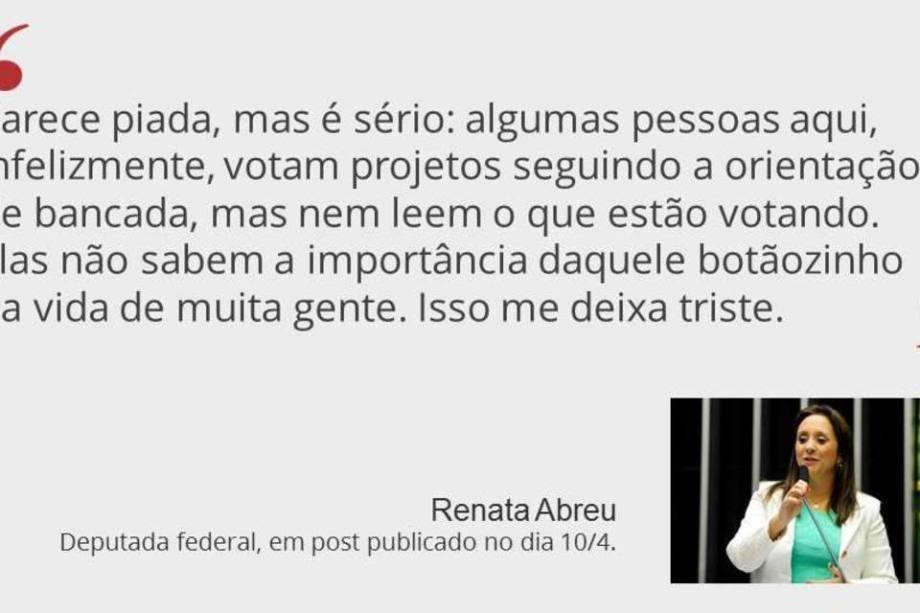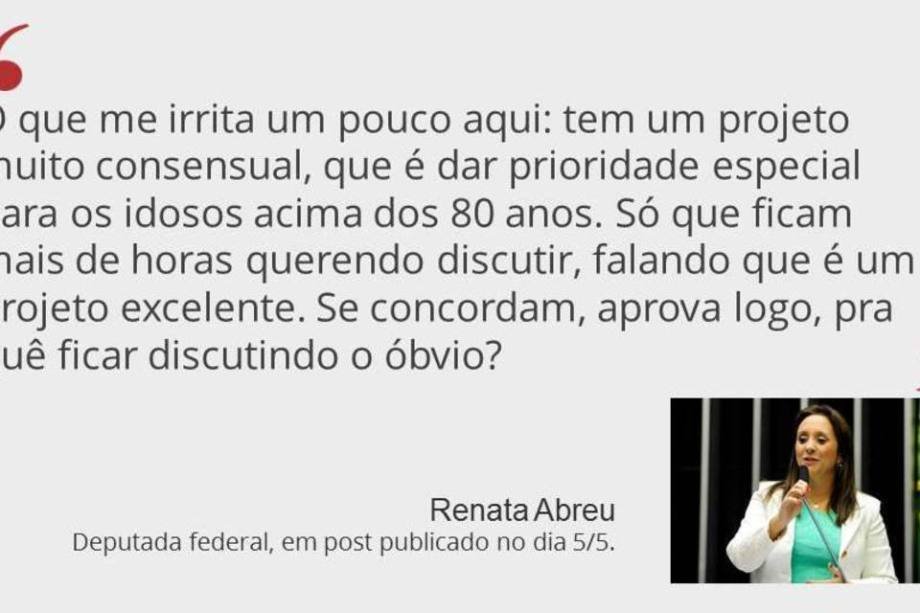 Renata Abreu - Os projetos de lei deveriam ser votados no plenário seguindo a ordem de apresentação. Hoje, quem decide o que será votado é o presidente da Casa. Então fica muito poder numa pessoa só. Isso engessa um pouco, dificulta para as pessoas conseguirem concretizar seus projetos. Todo mundo tem o direito de ter o seu projeto pautado, então tinha que ter um critério menos pessoal.