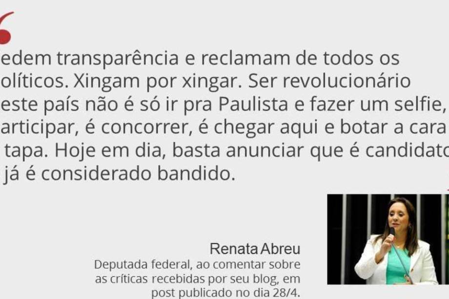 Renata Abreu - Ofendida não, porque em mim a carapuça não serve. Minha maior bandeira é a gente conscientizar os cidadãos sobre a política. Hoje, para ser candidato tem que ter coragem, porque você já é visto como bandido. Isso desestimula que pessoas de bem participem. A gente tem que fazer o contrário, tem que estimular. Tem gente que julga , diz que deputado não trabalha. Eu durmo quatro horas por noite, trabalho no final de semana. Aí tenho que ouvir que deputado não trabalha? Pode ser que tenha quem não trabalhe, como em qualquer profissão, mas não são todos.