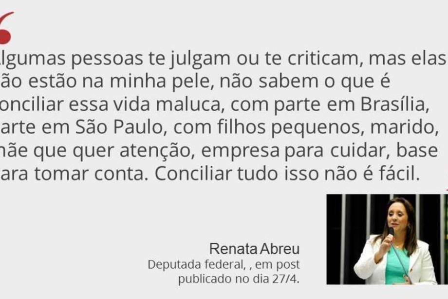 Renata Abreu - Quando eu comecei minha campanha, vivi uma experiência única. Eu não tinha experiência e não tinha mandato. E eu também via o nosso povo reclamando muito dos políticos, mas com muitas atitudes semelhantes. Então achei que as pessoas precisavam saber o que era uma campanha e um mandato de deputado. Resolvi fazer um diário para colocar tudo o que eu sinto, o que eu vejo. É algo sem criticas a A ou B, mas sim para mostrar a realidade do Congresso e para aproximar esse universo do eleitor. Esse é o intuito. Vi uma necessidade de compartilhar com o eleitor esses momentos, essas lutas, essas frustações e conseguir fazer com que esse eleitor não só critique, mas que fale com conhecimento de causa, vá para as ruas com conhecimento de causa, porque conhece os bastidores, e não generalize.