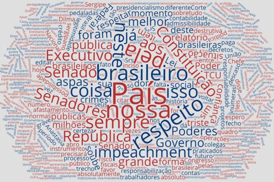 São Paulo – Nesta quarta-feira, o Senado se reuniu para discutir o processo de impeachment de Dilma Rousseff. Em uma maratona, os congressistas fizeram pronunciamentos ao longo de quase um dia todo. Cada senador teve 15 minutos para discursar. EXAME.com reuniu os discursos de cada um dos senadores e analisou as palavras usadas por eles. A seguir, você vê quais foram as palavras mais usadas por cada um dos senadores. Elas foram reunidas em uma nuvem. As maiores, foram as mais utilizadas ao longo do discurso. Senadores que votaram contra usaram palavras diferentes daqueles que votaram a favor da admissibilidade do processo de impedimento da presidente. Os senadores estão na ordem de pronunciamento. Veja a seguir.