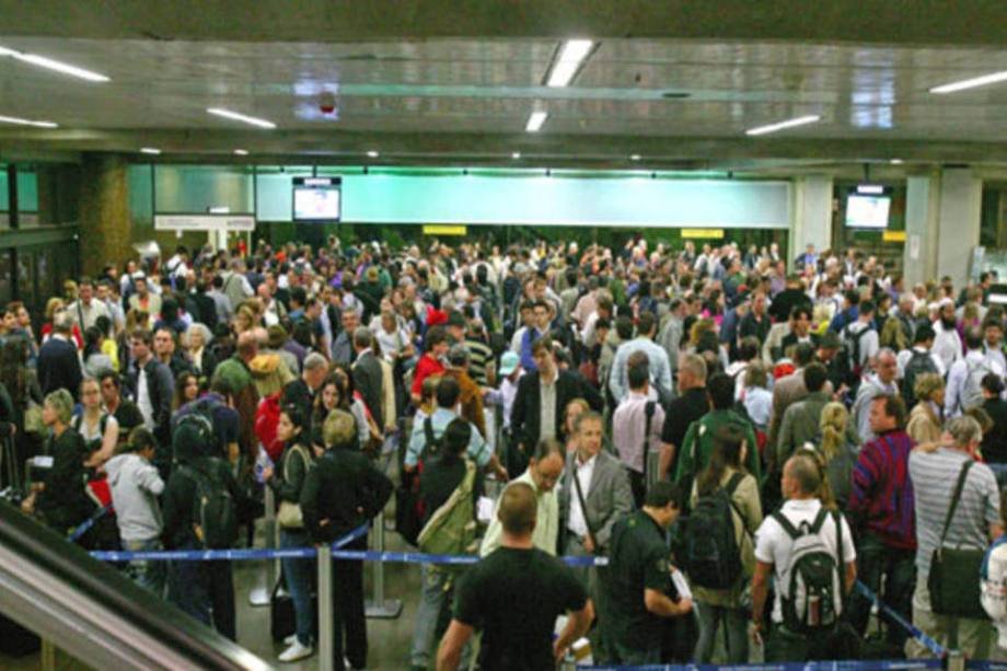 Aeroporto de Guarulhos, em São Paulo, que ultrapassou em 44% seu limite máximo, ao transportar 36 milhões de pessoas. A GRU Airport, empresa responsável por sua administração, garante que a construção de um novo terminal no local aumentará a capacidade em 12 milhões de passageiros até o início da Copa do Mundo. Outros aeroportos também passam por obras de ampliação devido ao evento. Mas, como até o final do ano passado as melhorias ainda não haviam sido concluídas, o brasileiro continua sofrendo com as lotações. Confira a seguir os aeroportos comerciais brasileiros onde os passageiros passam mais aperto: