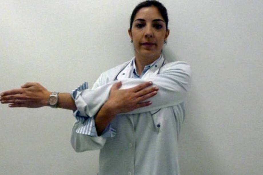 12. A fisioterapeuta  também  o alongamento lateral de braço.  Com o braço esticado à frente  tente trazê-lo para junto do corpo com o auxílio da mão. Faça o mesmo movimento com os dois braços. Tempo de permanência deve ser de 15 a 20 segundos em cada posição