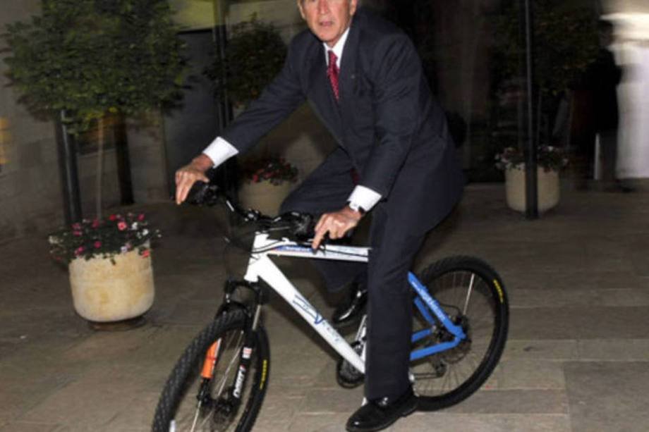 O ex-presidente dos Estados Unidos George W. Bush adotou as pedaladas como um hobby, após começar a andar de bicicleta para manter-se saudável. A paixão pelo esporte cresceu e ganhou notoriedade. Tanto que, em 2008, em uma visita a Israel, ganhou um modelo novo de presente do primeiro-ministro israelense Ehud Olmert. Na foto, ele estreia o brinquedinho recebido na ocasião.