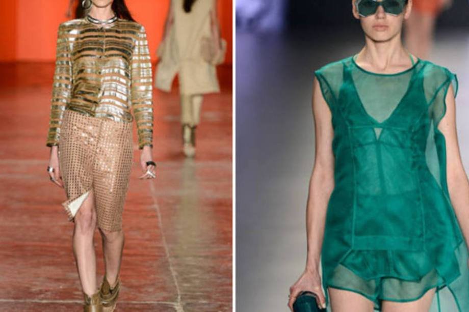 Outro tecido recorrente nos desfiles da semana foi a organza, com sua transparência e força, ao mesmo tempo. Algumas das marcas que usaram esse material foram a Triton, a Ellus (esq.) e a Osklen (dir.), em diferentes aplicações e cores.