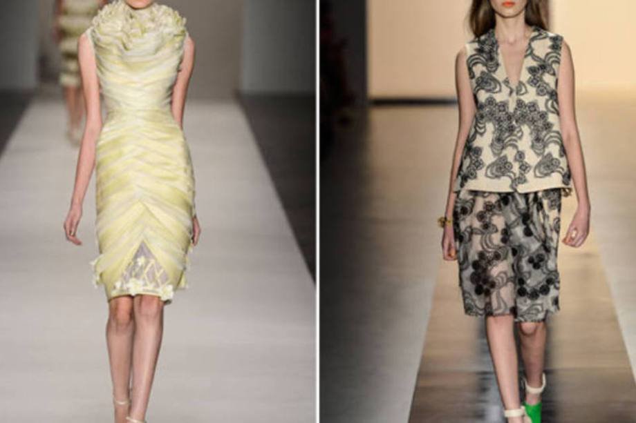 Golas, ombros, barras e silhuetas deverão ter um toque assimétrico, de acordo com as passarelas da São Paulo Fashion Week deste ano. A tendência foi indicada em desfiles como o da Animale, Tufi Duek (esq.) e Amapô (dir.), que levaram lados com cortes diferentes em um mesmo look.