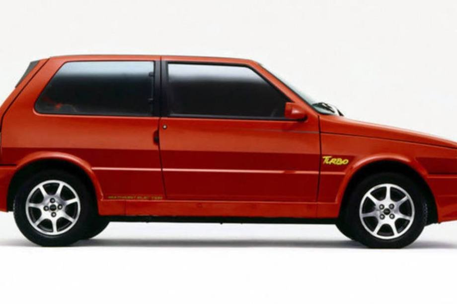 Uno Turbo foi o primeiro carro fabricado no Brasil a sair de fábrica com turbocompressor. Grande novidade da linha 1994, o modelo trazia um motor de 1.372 cm3 e oito válvulas da família Sevel, sobrealimentado por uma turbina Garrett T2 com 0,8 bar. O resultado era uma potência de 118 cv e torque máximo de 17,5 mkgf, números suficientes para levá-lo de 0 a 100 km/h em apenas 9,2 segundos. Mas a Fiat não se preocupou apenas em botar um motor turbinado no cofre do pequeno Uno. Foram realizadas outras alterações, incluindo suspensão recalibrada e rebaixada em 10 milmetros, instalação de um radiador de óleo, discos de freios maiores, barra estabilizadora na traseira e amortecedores com maior carga. Some tudo isso ao baixo peso do veículo (975 quilos) e você entenderá porque o Uno Turbo era capaz de deixar rivais renomados - como VW Gol GTi, Ford Escort XR3 e Chevrolet Kadett GSi - para trás. Aerofólio traseiro, para-choques exclusivos e rodas de 14 polegadas equipavam o hot-hatch, que era vendido em três opções de cores (amarelo, preto e vermelho). O interior tinha bancos esportivos, volante de três raios e painel com manômetros turbo, óleo e temperatura do óleo. Apesar de cobiçado, o Uno Turbo teve vida curta no Brasil, saindo de linha em 1996 após apenas 1.081 unidades produzidas.