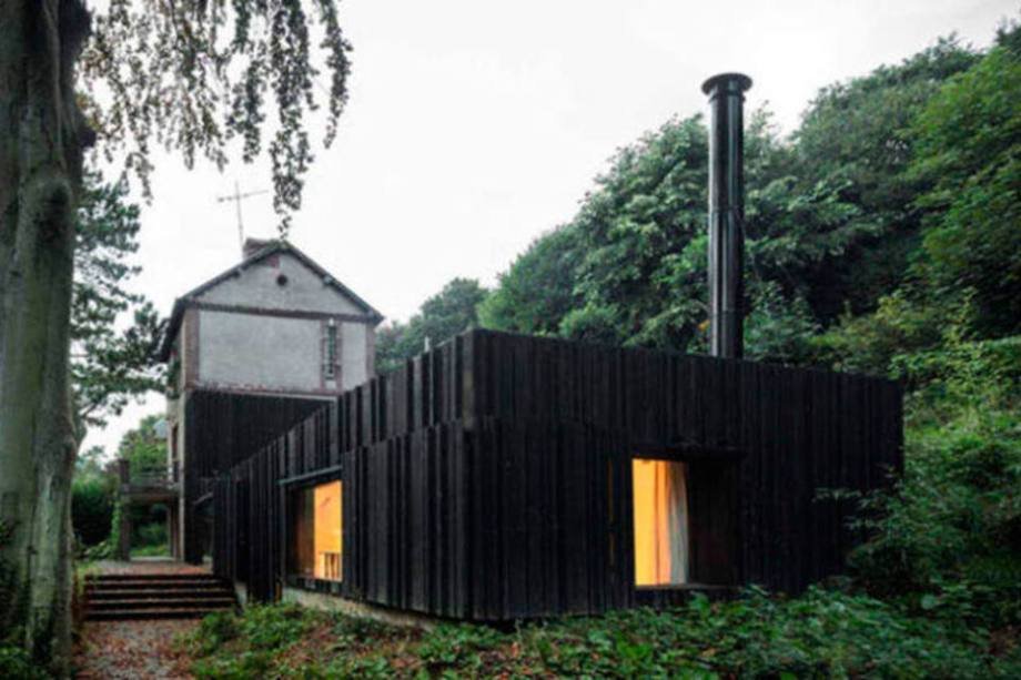 Escondida em uma floresta na Normandia, França, essa casa tem um truque curioso que garante ainda mais privacidade aos moradores: a parte da frente, original e de tijolinhos, possui apenas quartos e escritórios. Todos os ambientes de vivência comum foram reconstruídos na parte de trás do terreno, em uma estrutura leve e preta, bem iluminada e com grandes janelas que podem ser tampadas por cortinas. Ela ainda é cercada por diversos tipos de vegetação, passando a impressão de distância do mundo exterior. Por Marchi Architects.