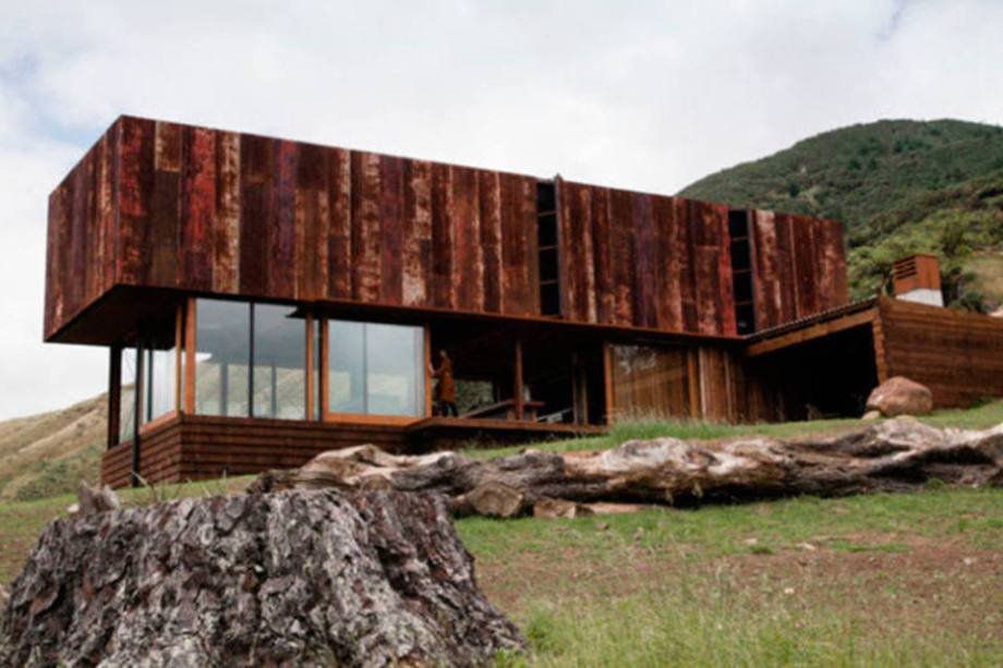 Essa casa de férias foi construída para ser o retiro de relaxamento de um casal que trabalha na indústria cinematográfica. Projetada pelo escritório Herbst Architects, seu design toma a personalidade dramática da profissão de seus moradores, com grande destaque aos elementos rústicos e uma fachada com aparência enferrujada. Ela fica entre 20 hectares de fazenda, na península de Coromandel, na Nova Zelândia -- espaço que permite que o casal seja completamente autossuficiente. Uma pequena lareira no centro da casa acalenta o ambiente e faz com que ela seja um refúgio especialmente aconchegante.