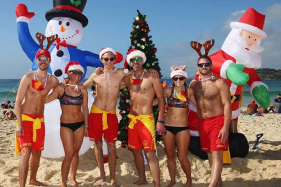 Nesta praia em Sidney, Austrália, salva-vidas posam para uma foto junto da famosa decoração natalina do local.