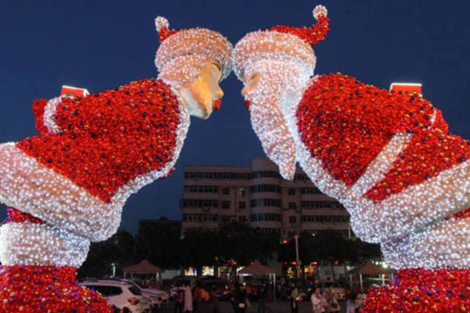 O beijo do Papai Noel e da Mamãe Noel: em um shopping em Henan, na China.