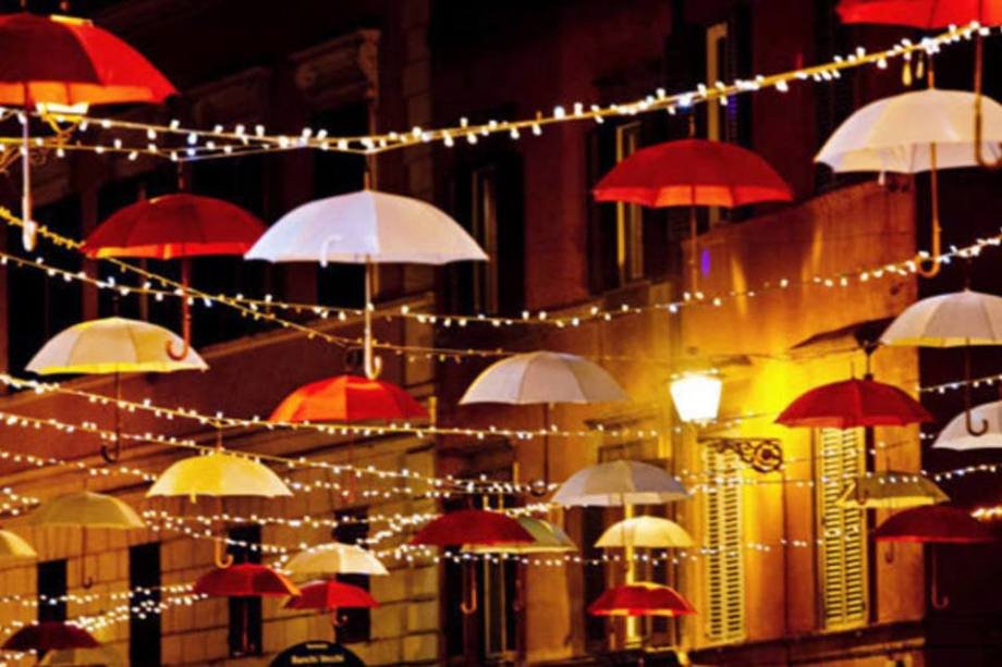Em uma rua famosa no centro de Roma, luzes e guarda-chuvas brancos e vermelhos encantam as pessoas.