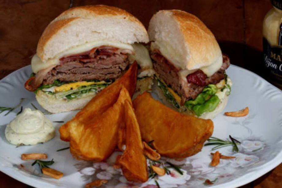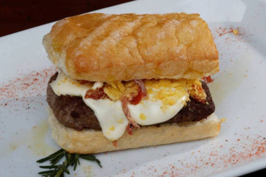 Restaurante: Nico Hamburgueria Sanduíche: Galinha Pintadinha Preço: 29,90 reais Ingredientes: Filet mignon, batata rústica, queijo muçarela de búfala, bacon, alface romana e ovo frito com maionese trufada no pão especial Endereço: R. Cisplatina, 31 – Ipiranga – Tel: (11) 2062-8000