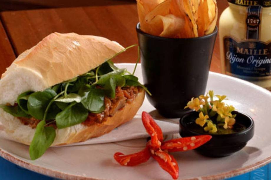 Restaurante: Manguinha Gastrobar Sanduíche: Sanduba de Costelinha Preço: 27 reais Ingredientes: Pão francês sem miolo recheado com costelinha suína desfiada, cheddar e barbecue Endereço: R. Graúna, 87 – Moema – Tel: (11) 5093-7982