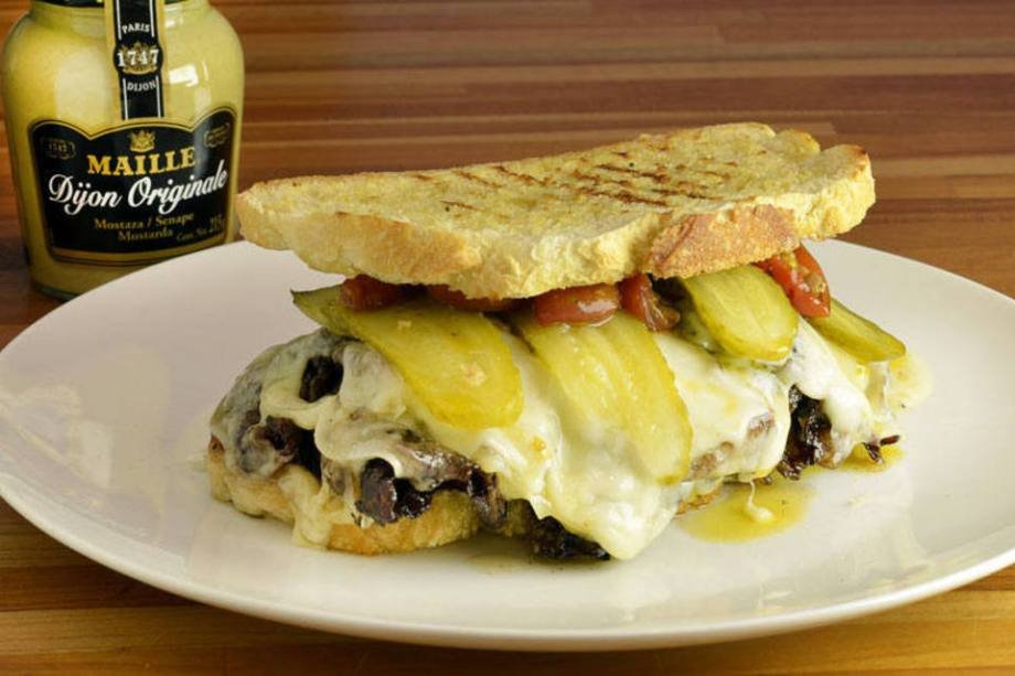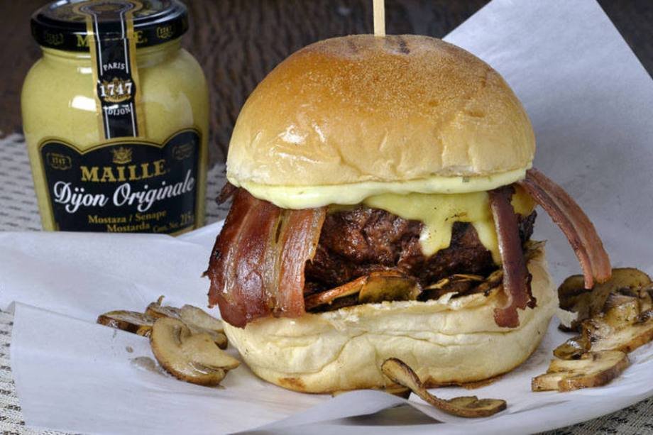 Hambúrguer de 220 gramas, queijo gruyére, cogumelos paris chapeados, bacon curado na pimenta e maionese da casa no pão de hambúrguer. Endereço: Alameda Lorena, 53 – Jardim Paulista