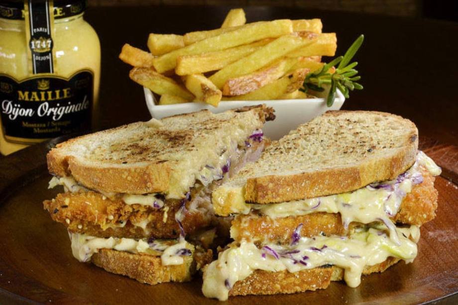 Pão italiano torrado, file de frango empanado e coleslaw defumada (salada americana de repolho e cenoura), acompanhado de fritas. Endereço: Rua Padre João Manuel, 1055, Cerqueira César.