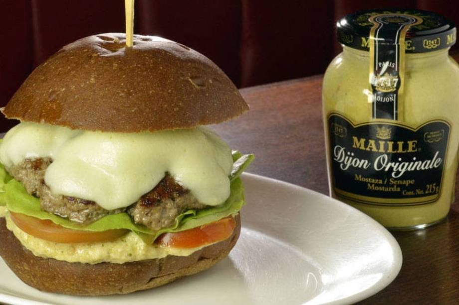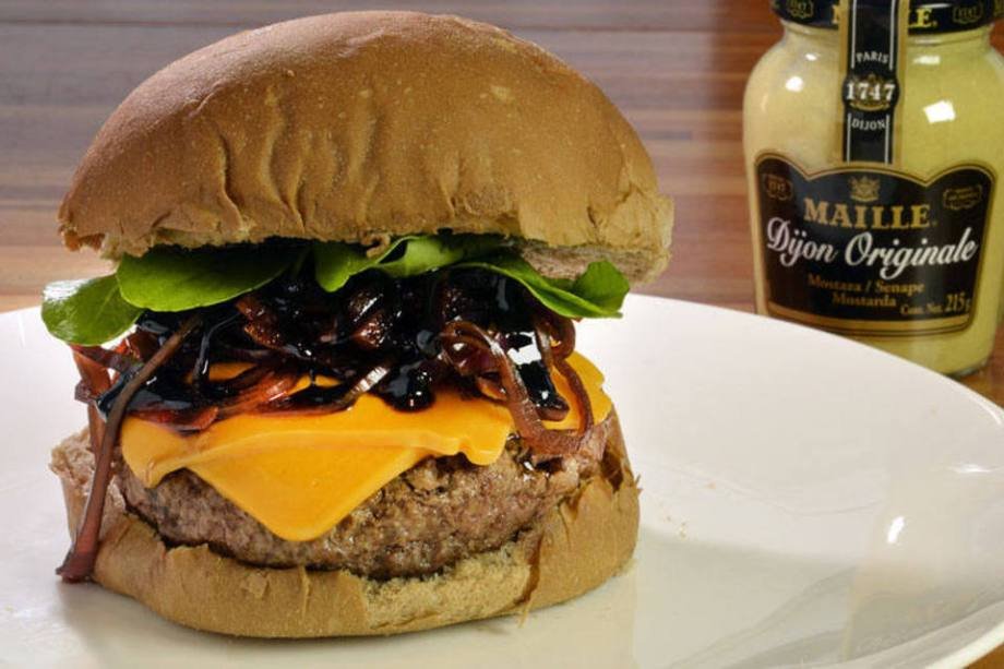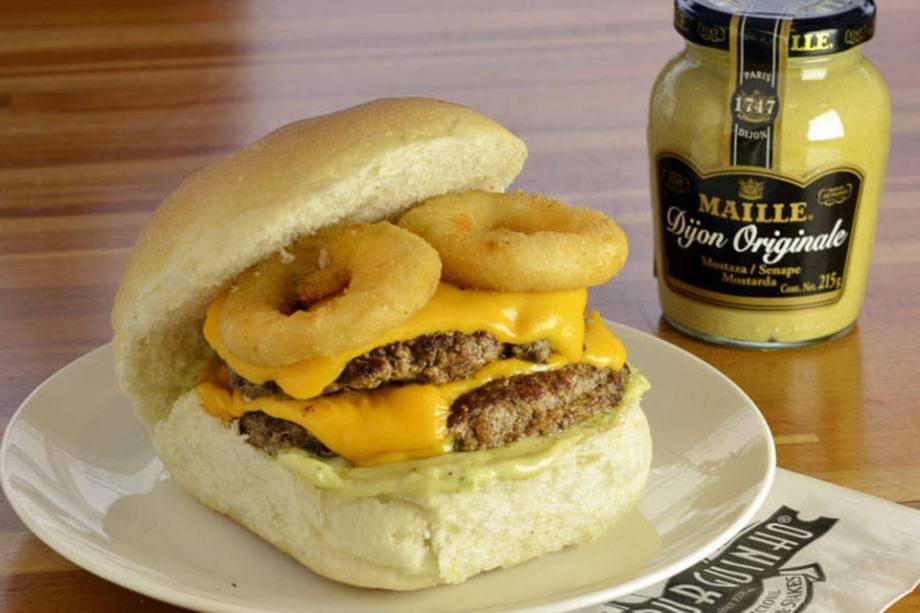 Hambúrguer de calabresa de 120g, com queijo prato, mostarda Dijon Maille, cebola caramelizada e maionese caseira, no pão de hambúrguer Double Burguer Onion – R$ 28,90 (foto)