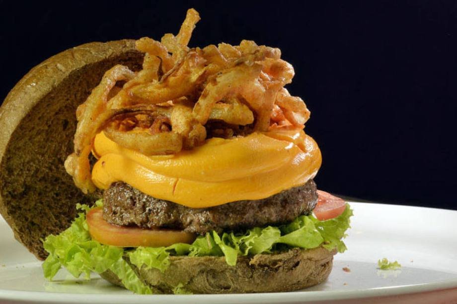 Dois hambúrgueres de 120g, com queijo cheddar, onion rings, maionese artesanal no pão de hambúrguer. Endereço: Alameda dos Arapanes, 1184, Moema