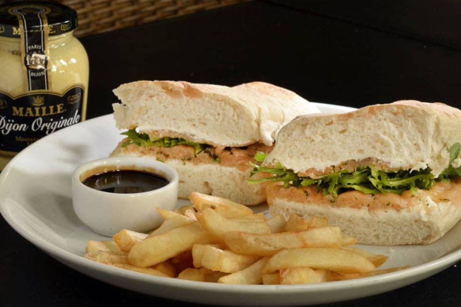 Pão de ciabatta, salmão defumado com endrodill, cream cheese, alface frisée e molho teriake. Endereço: Rua Grauna, 87, Moema