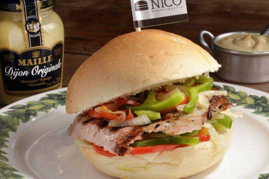 Pão de hambúrguer, filet de frango fatiado, cebola e pimentão confitados, alface, tomate, molho de mostarda e estragão Hall of Fame – R$ 46 (foto)