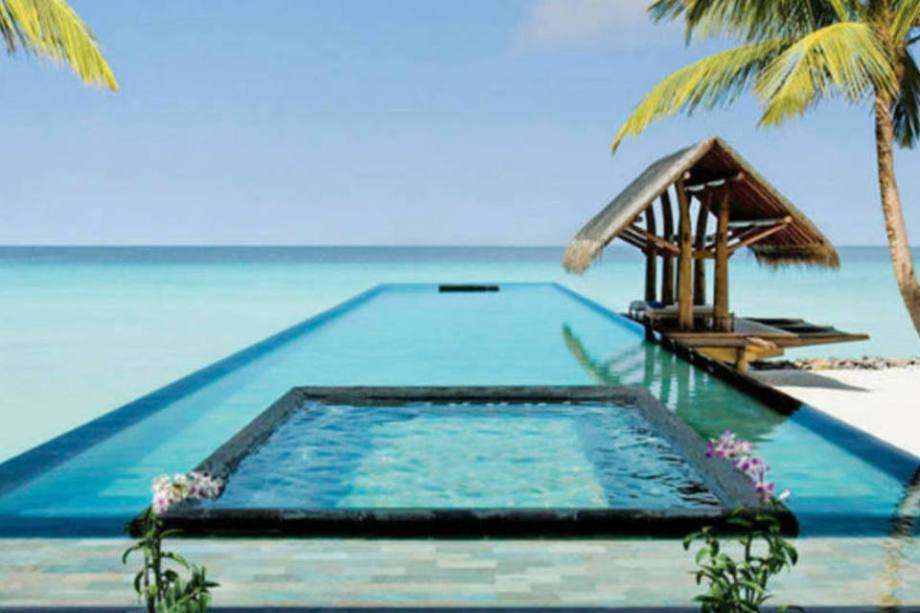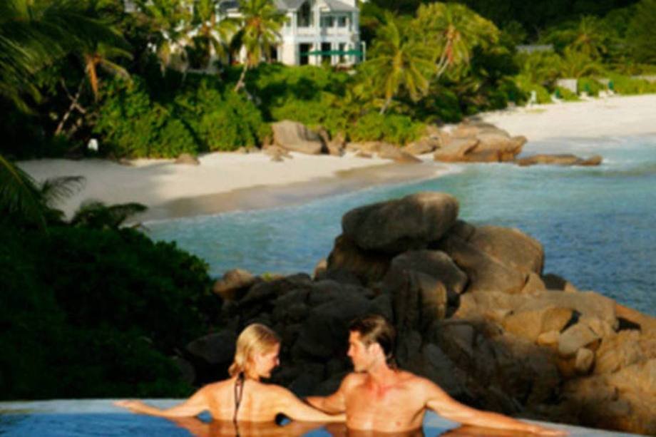 Já imaginou assistir ao pôr do sol dentro desta piscina? Sim, ela é cercada por palmeiras e fica no luxuoso resort Banyan Tree, na Ilha da Mahé (Seychelles).