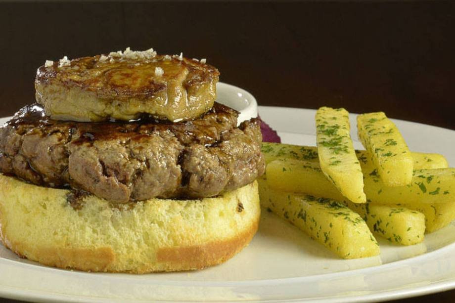 Hambúrguer Rossini: filé mignon picado na faca servido sobre o pão brioche com foie gras grelhado, molho de vinho tinto, azeite trufado e batata gaufrette. Preço: R$ 55 Rua Manuel Guedes, 233 – Itaim Bibi – Tel: (11) 3078-5919