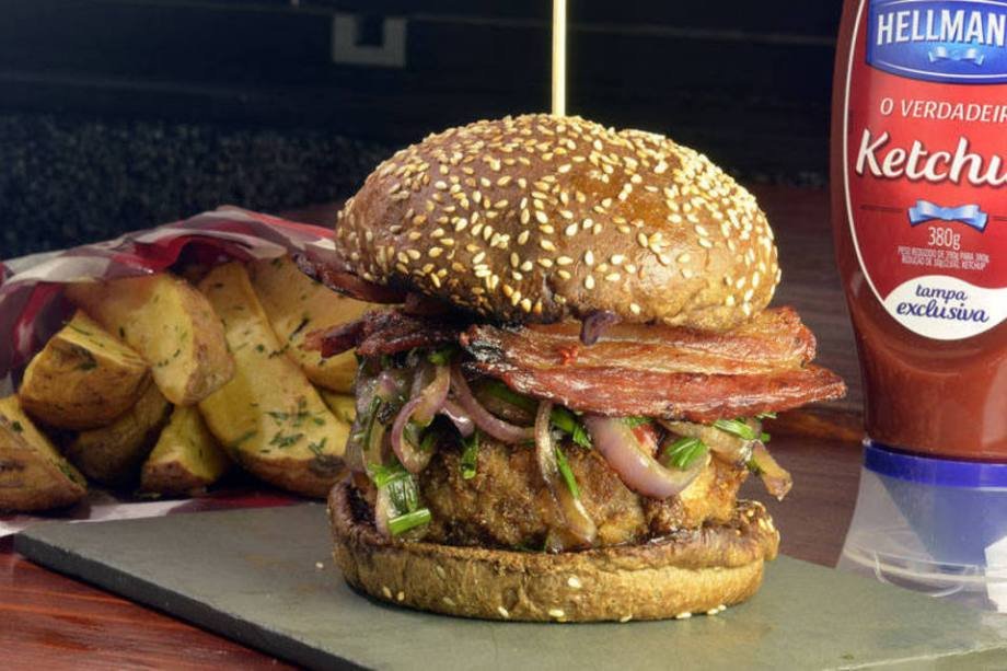 Top du Top: hambúrguer de copa lombo empanado em mostarda e farinha de rosca, bacon, molho hoissim, molho de pimenta chinesa, nirá e cebola roxa puxado em óleo de gergelim torrado, no pão de hambúrguer com gergelim. Preço: R$ 36 Endereço: R. Jerônimo da Veiga, 358 - Itaim-Bibi - Tel: (11) 3071-2926