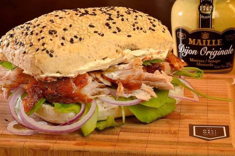 Deli Pork Sandwich: Pao português especial, tostado na manteiga, maionese de pimenta "bhut jolokia", lombo suíno confitado com limão siciliano e cachaça envelhecida, baby rúcula, mix de cebolas roxas e cheiro verde. Acompanha água Perrier. Onde: Rua Leopoldo Couto Magalhães Junior, 671 - Itaim-Bibi. Preço: R$ 15