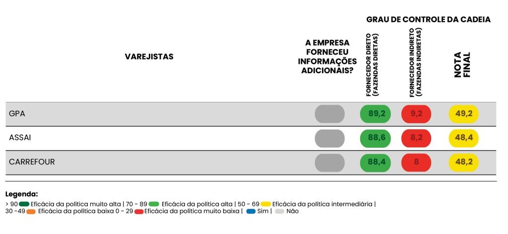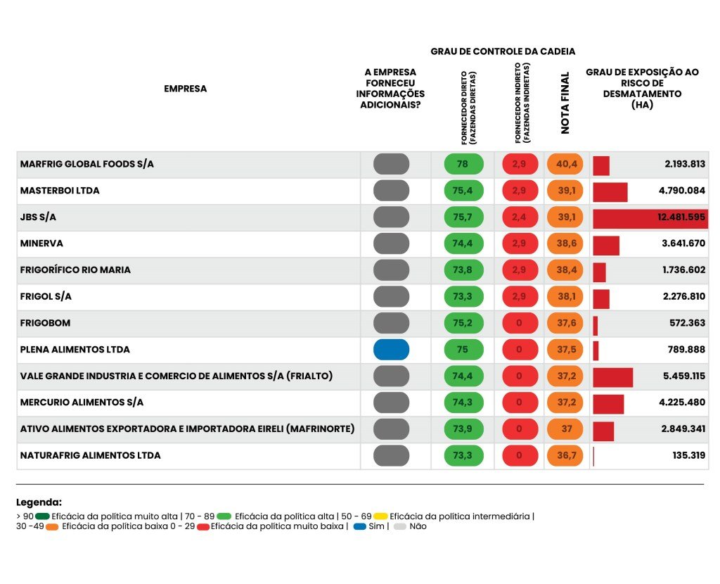 Apenas 12 frigoríficos e 3 redes de supermercados conseguem comprovar alto controle das fazendas fornecedoras diretas de gado em sua cadeia de carne bovina. O frigorífico com melhor pontuação foi a Marfrig Global Foods, seguida por Masterboi e JBS.