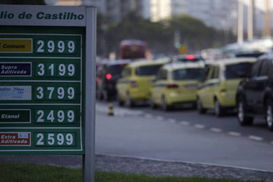 Preços de gasolina, álcool e diesel vistos na placa de um posto de combustível, ao lado do tráfego na praia de Copacabana no Rio de Janeiro (Ricardo Moraes/Reuters)