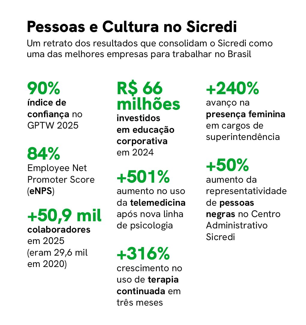 Nos últimos cinco anos, o Sicredi viveu um crescimento expressivo: passou de 29,6 mil colaboradores, em 2020, para mais de 50,9 mil, em 2025. Mesmo com a expansão, mantém a mesma cultura de proximidade e participação, que valoriza a escuta ativa, o diálogo e a presença das lideranças no dia a dia das equipes.