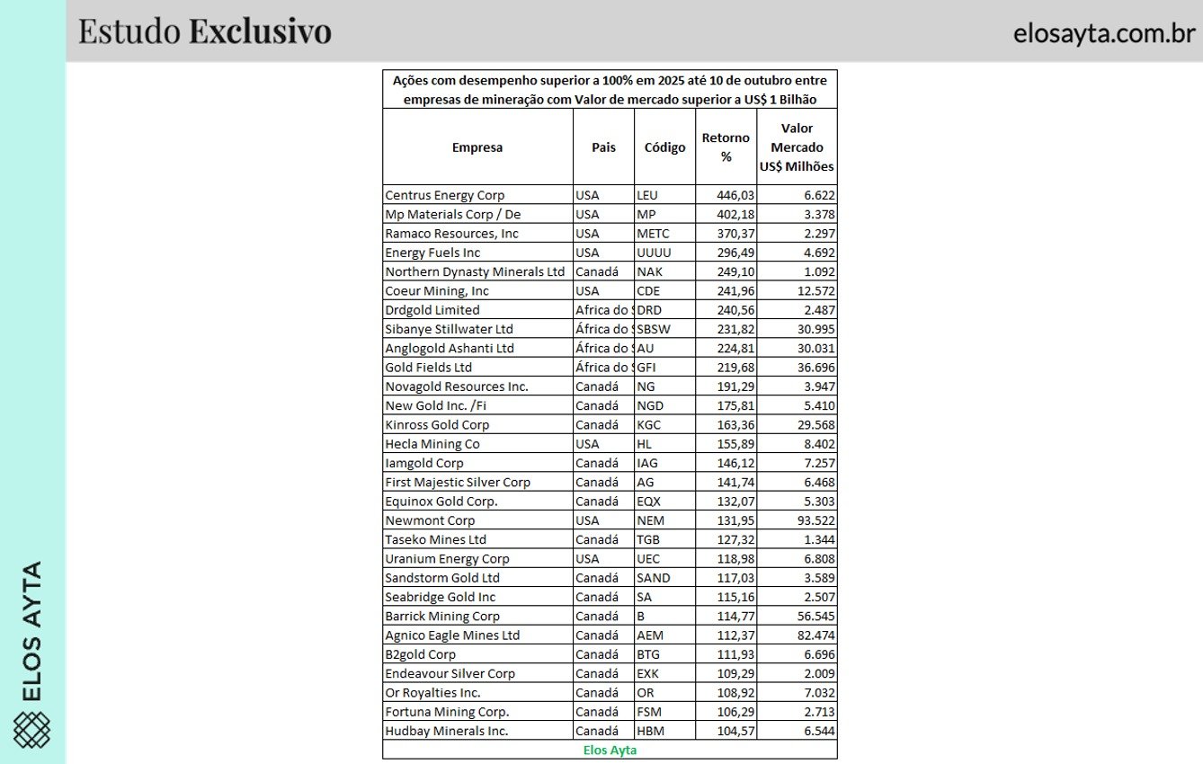 De acordo com levantamento da consultoria Elos Ayta, 27 mineradoras com valor de mercado acima de US$ 1 bilhão apresentaram alta superior a 100% até 10 de outubro.