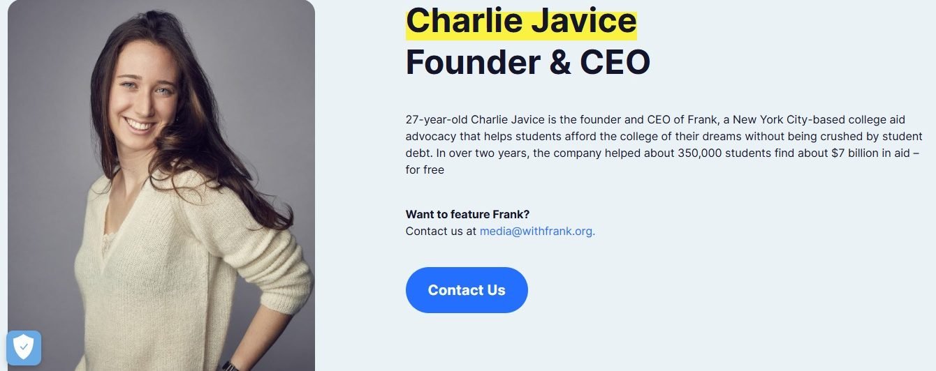 Fundadora da startup Frank em 2016, Charlie Javice criou uma plataforma online que simplificava o preenchimento do FAFSA, formulário federal usado por estudantes para solicitar ajuda financeira para a faculdade. A iniciativa chamou a atenção do JP Morgan Chase, que completou a compra da Frank em 2021.