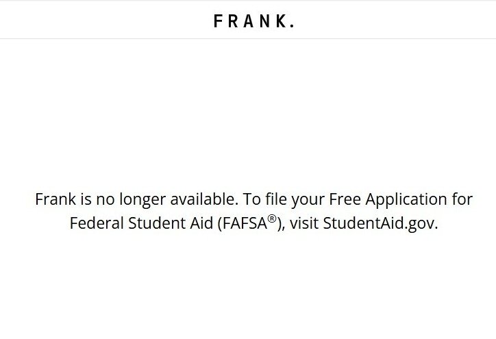 O site da Frank foi derrubado em janeiro de 2023. Nesse momento, página instruia os potenciais clientes a enviar suas candidaturas ao FAFSA por meio do site oficial do governo americano.