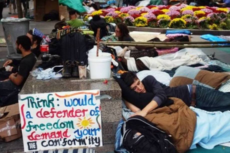 Os protestantes começaram a chegar à Wall Street nas últimas duas semanas e querem uma menor influência do dinheiro corporativo nas decisões políticas, além de outras reivindicações.