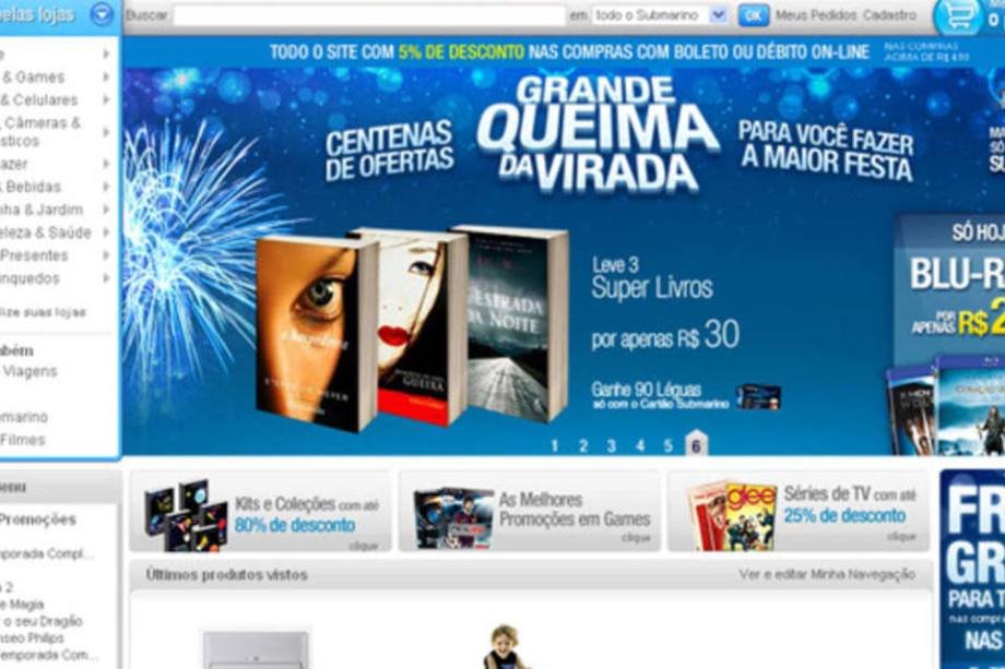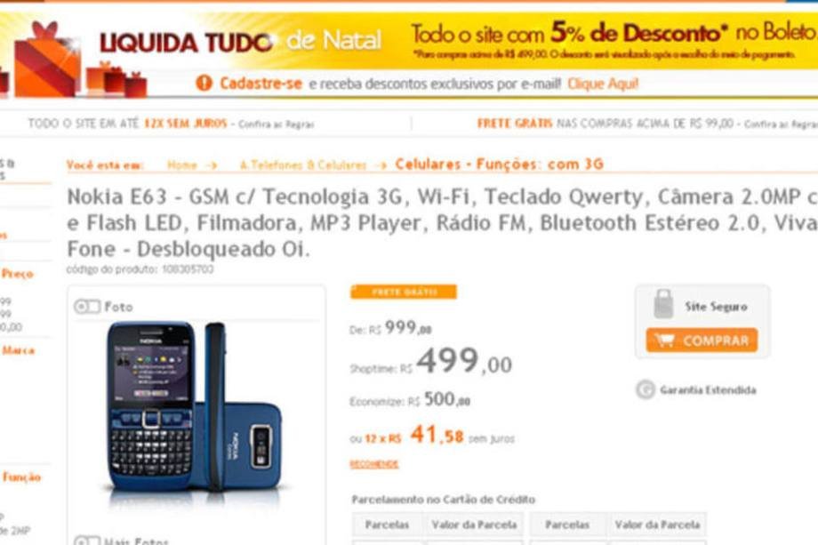 Outra opção para aproveitar o finalzinho das liquidações pós-Natal virtuais é a “Liquida Tudo de Natal” do Shop Time. Até esta quinta-feira (30), o site oferece descontos em aparelhos eletrônicos, eletrodomésticos e eletroportáteis, além de utilidades domésticas e itens de decoração. O celular Nokia E63, por exemplo, caiu à metade do preço, de 999 por 499 reais. Já a câmera digital à prova d’água Stylus teve um desconto de 40%, passando de 699 para 399 reais.