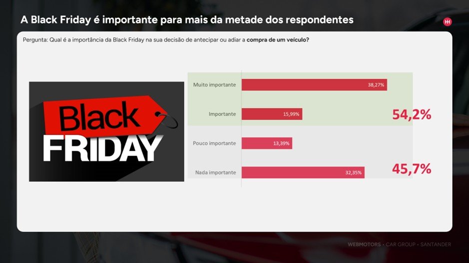 Realizada entre 22 e 24 de outubro com mais de 4 mil participantes, a pesquisa revelou que 38,27% dos respondentes consideram a Black Friday "muito importante" para adiantar ou postergar a compra de um carro ou moto. Outros 16% a consideram "importante", enquanto 13,39% a classificam como "pouco importante" e 32,35% como "nada importante".