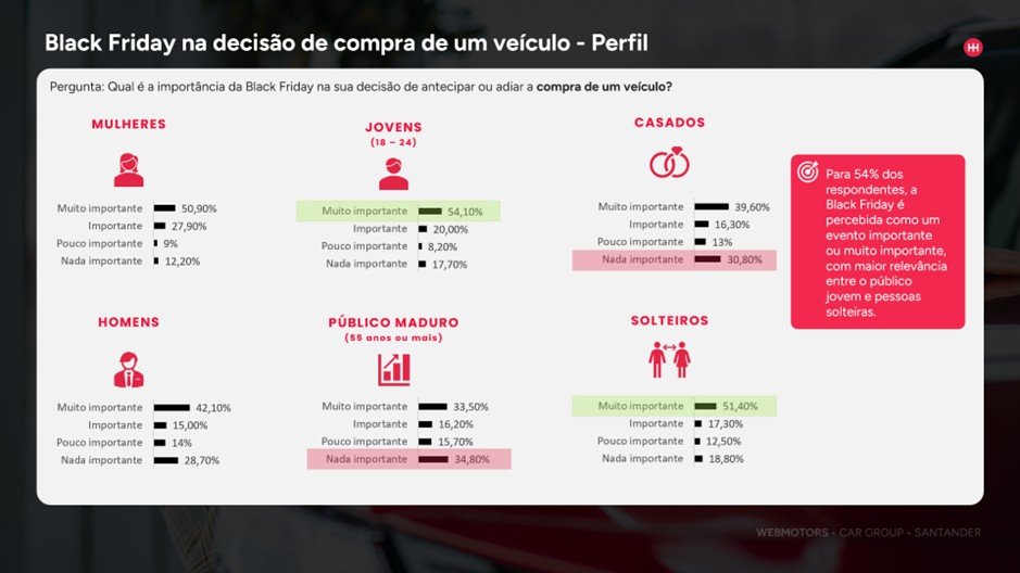 A pesquisa também identificou os perfis de consumidores que mais consideram o período promocional como relevante para tomar decisões sobre a compra de veículos. Entre aqueles que acham a Black Friday "muito importante", destacam-se os jovens de 18 a 24 anos (54,10%), seguidos por solteiros (51,40%), mulheres (50,90%) e homens (42,10%).