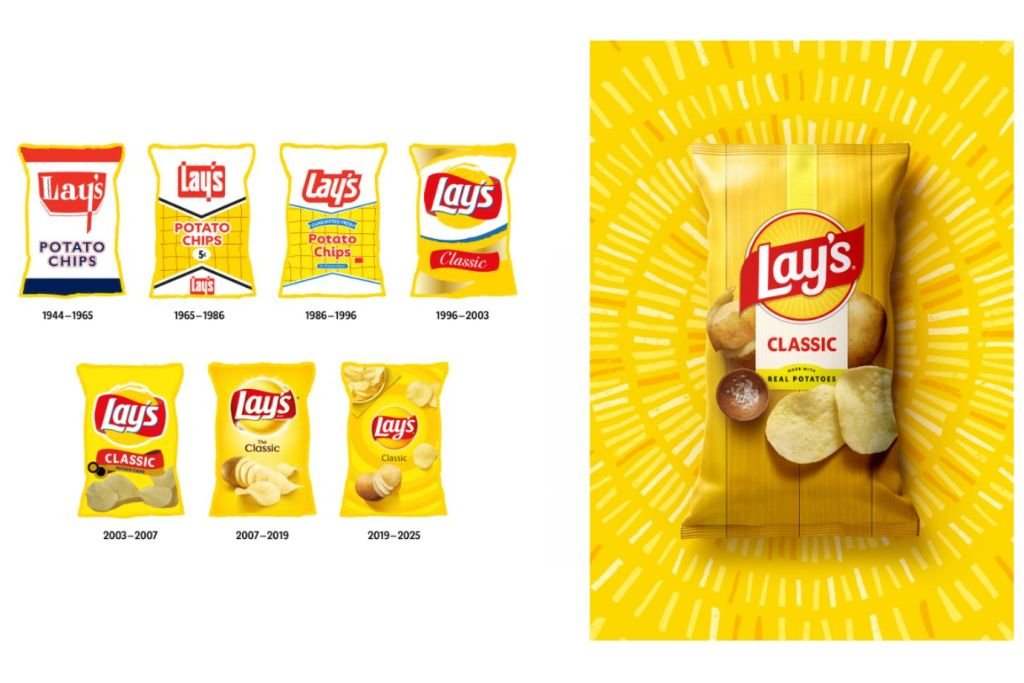 Evolução das embalagens da Lay’s desde 1944 até a nova versão de 2025 (Reprodução/Pepsico.com)