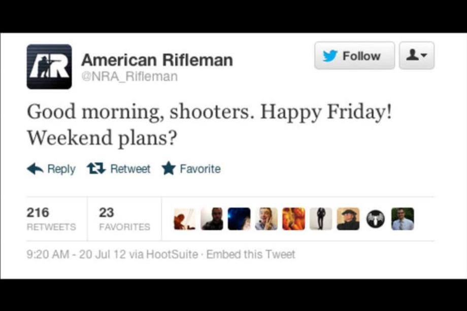 A Associação Nacional de Rifles (NRA na sigla em inglês) nos Estados Unidos, sentiu na pele o efeito de um tuíte agendado fora de contexto: postou uma mensagem em apoio às armas após um tiroteio ocorrido no cinema na cidade de Aurora, Colorado, durante a sessão de pré-estreia do filme Batman - Dark Knight Rises. Poucas horas depois da morte de 12 pessoas no dia 20 de julho, o texto anunciava: “Bom dia, atiradores! Boa sexta-feira! Algum plano para o fim de semana?” A entidade defendeu-se dizendo que o post fora criado antes da tragégia.