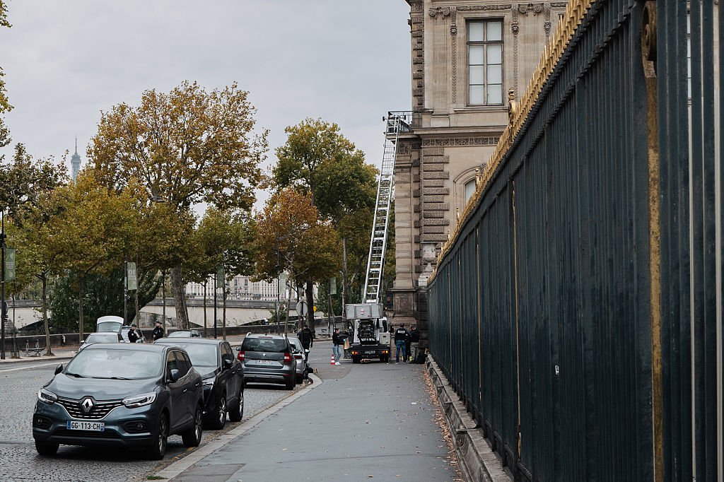 Pouco antes das 9h30, horário do roubo no Louvre, um veículo utilitário com uma cesta elevatória ou plataforma foi posicionado junto à fachada do Louvre voltada para o Rio Sena. Imagens e relatos da cena mostram o equipamento encostado na varanda do segundo nível, o que permitiu aos assaltantes alcançar uma janela sem passar por entradas principais.