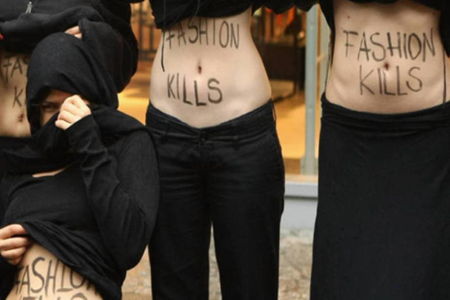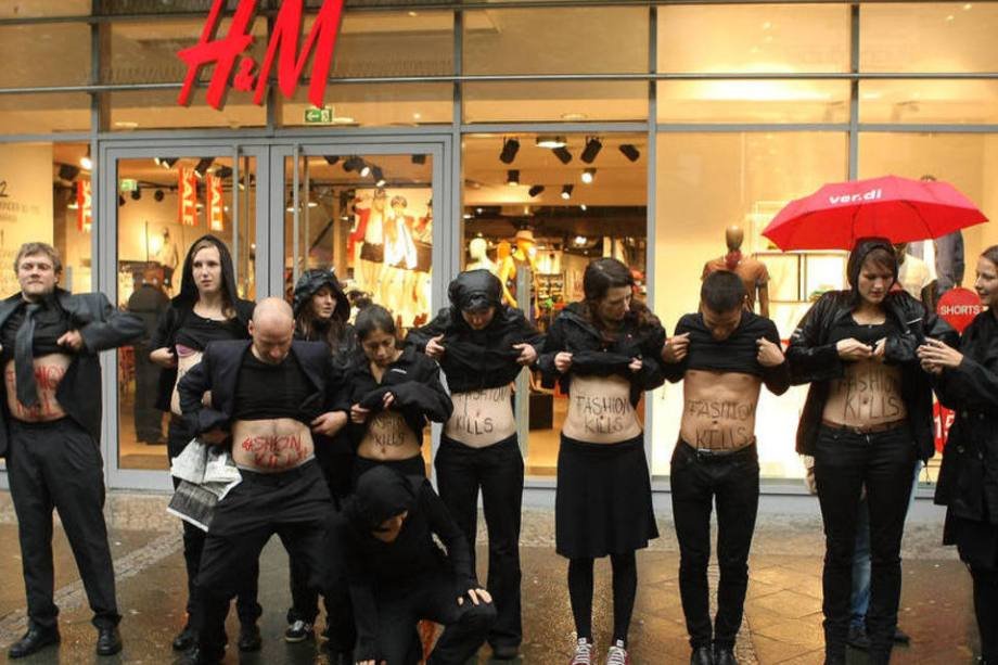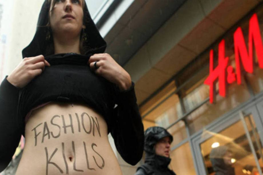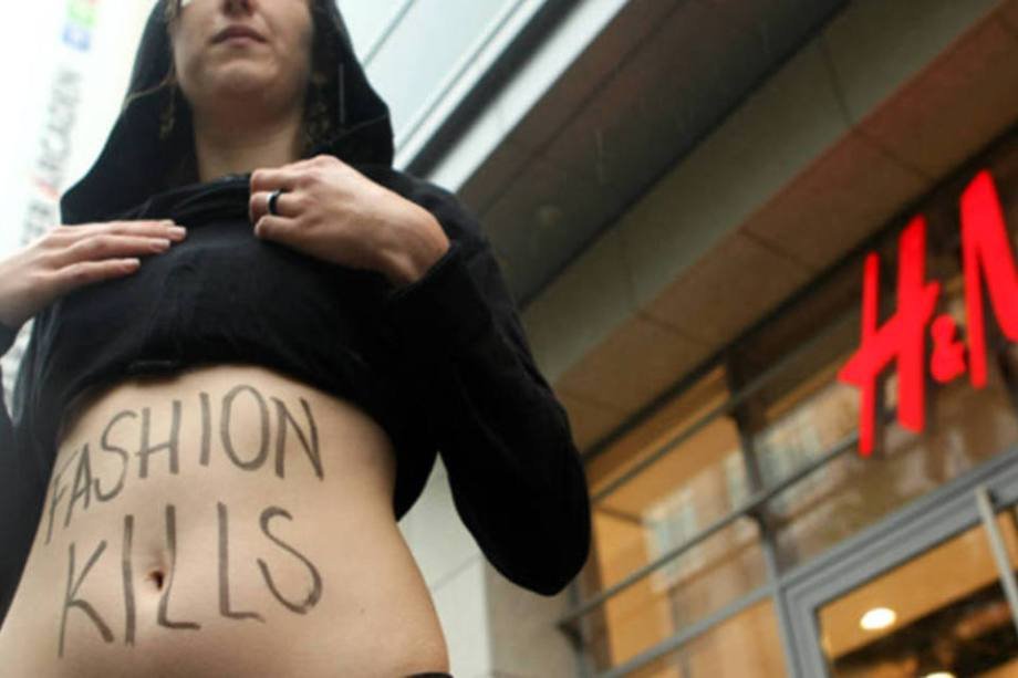 Manifestantes se reuniram em frente a uma das lojas da H&M no shopping Wilmersdorfer Arcaden, em Berlim, na Alemanha e pintaram na barriga frases com as palavras "fahion kills" (em portugês, moda mata).