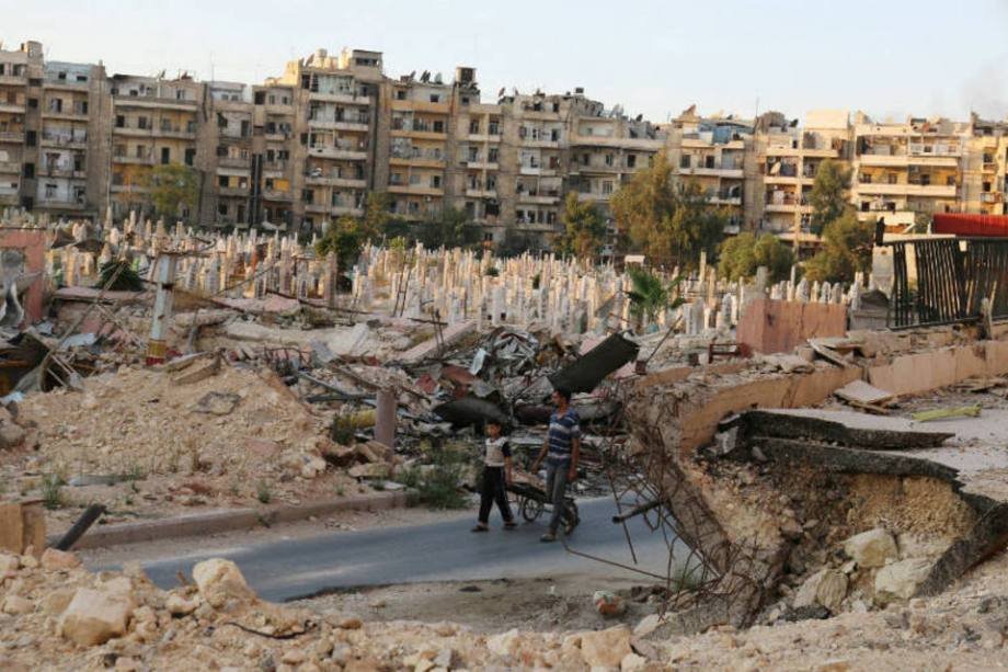 Pessoas caminham próximas de um cemitério superlotado em um bairro de Aleppo controlado por rebeldes. A cidade é uma das mais devastadas pela guerra civil síria que já dura mais de cinco anos. Nesta semana, o presidente sírio Bashar al-Assad ofereceu a anistia aos insurgentes que deixassem a cidade. Do lado dos opositores, no entanto, a oferta é vista como armadilha.