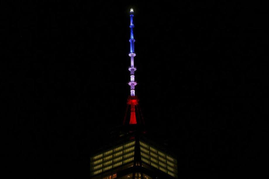 6. Agulha do One World Trade Center iluminada com as cores da França em homenagem a Paris depois dos ataques terroristas do dia 13 de novembro de 2015