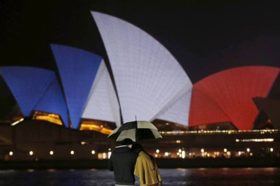 13. Casal observa a Sydney Opera House nas cores da bandeira francesa, em tributo às vítimas dos atentados terroristas a Paris, França.